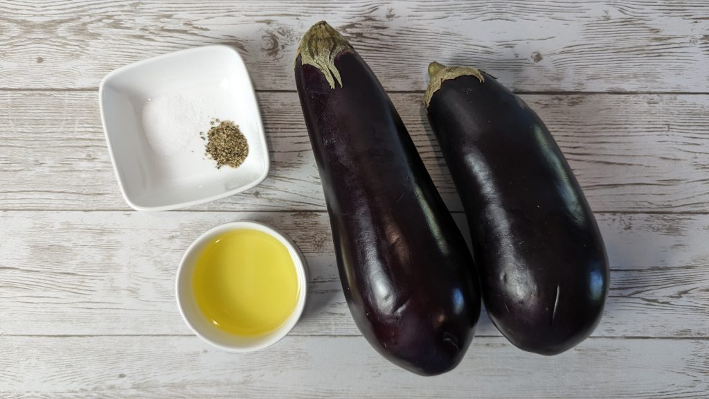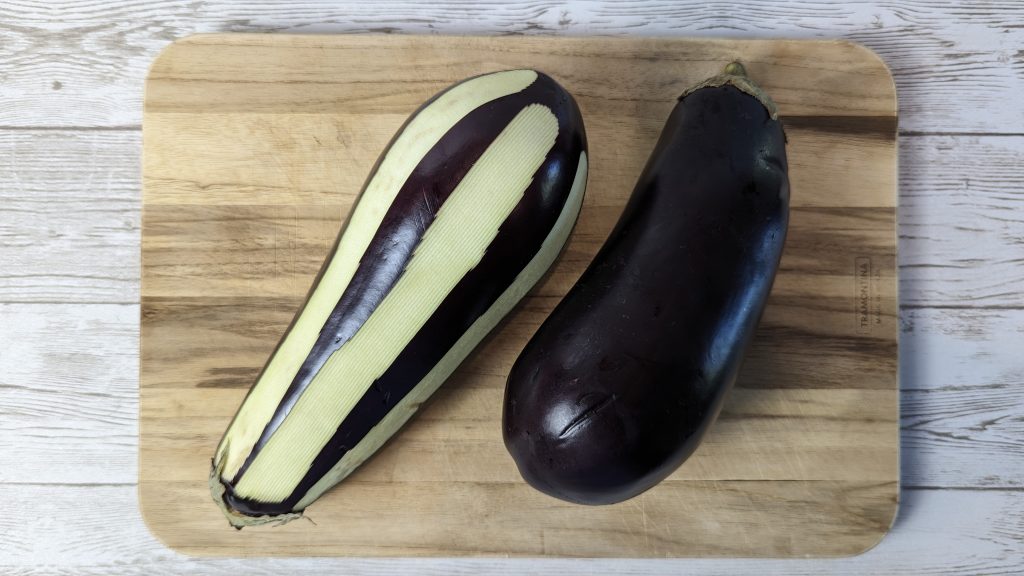 First, rinse and peel the eggplants. The skin can be chewy, so remove all of it if you want to avoid that. Otherwise, peeling in strips helps maintain the integrity of the vegetable while limiting the chewiness.