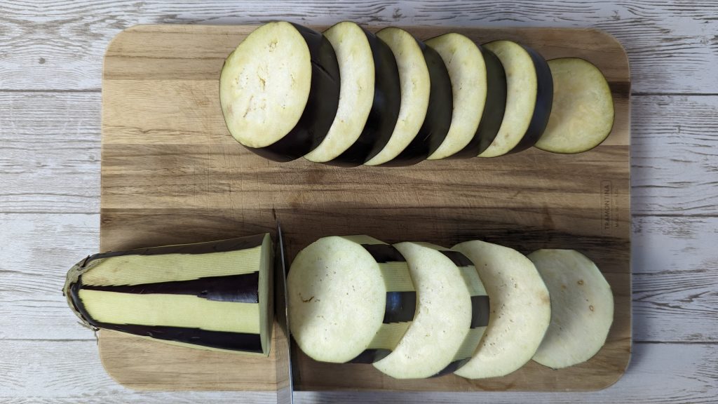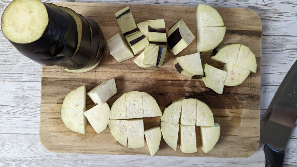 Slice eggplant into ¼ inch rounds. Then take each round and cut into approximately 1 inch cubes.