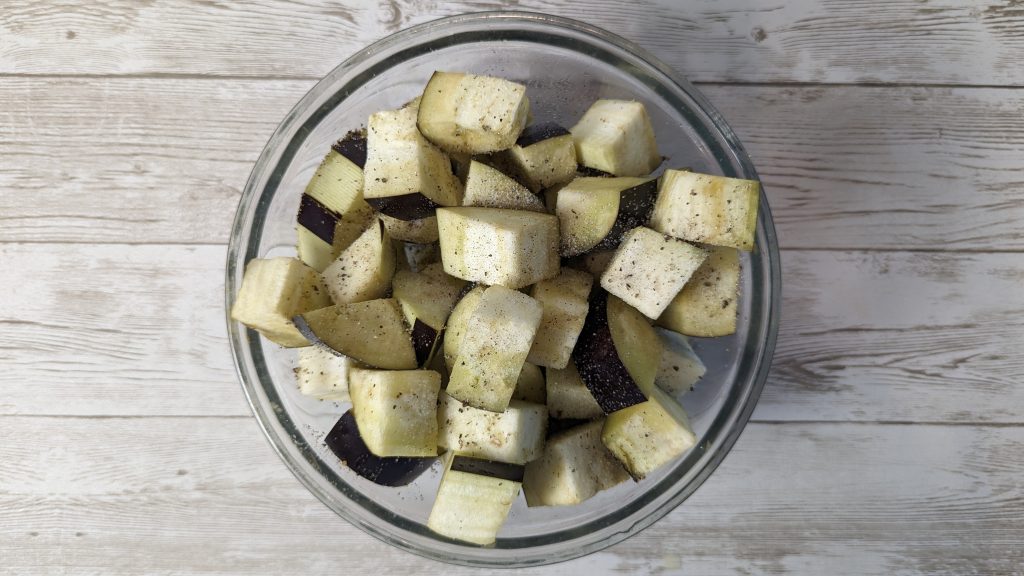 Place eggplant cubes into a medium bowl and toss with olive oil, salt, and pepper.