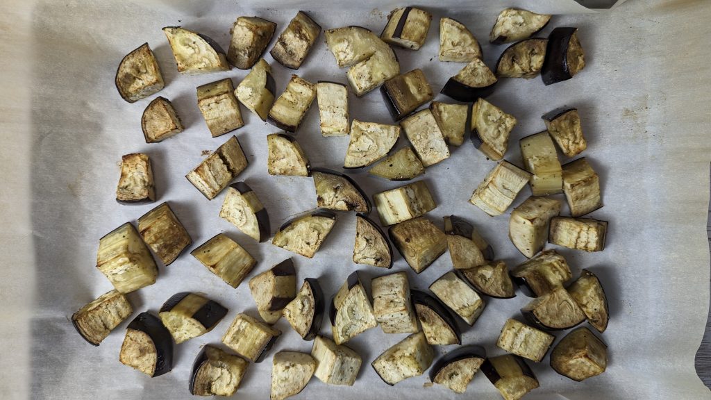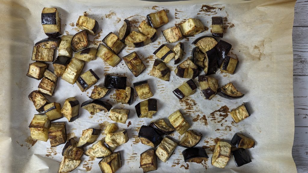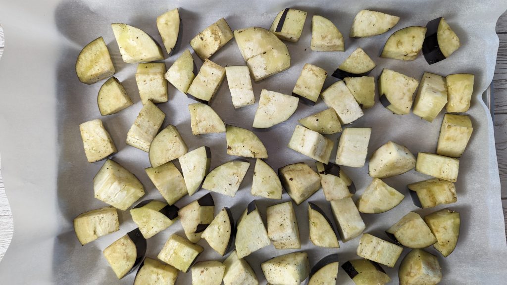 Remove tray, turn eggplant cubes, and return to the oven to roast for another 15-20 minutes. Eggplant should be soft and caramelized, but not shriveled.