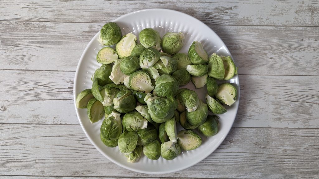 - Prepare brussels sprouts by cutting off a small end of the stem and removing no more than one outer leaf layer. Cut in halves. Some loose leaves are fine and will crisp up nicely.