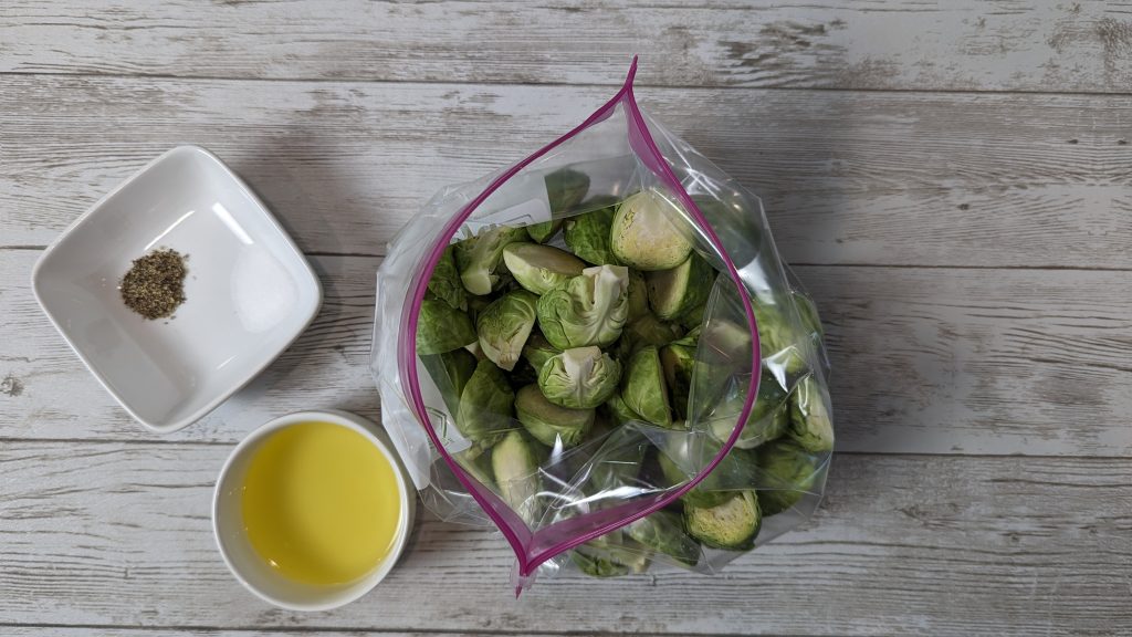 Place prepared brussels sprouts in a sealable baggie. Toss with olive oil, salt, and pepper. Shake baggie until each sprout is coated.