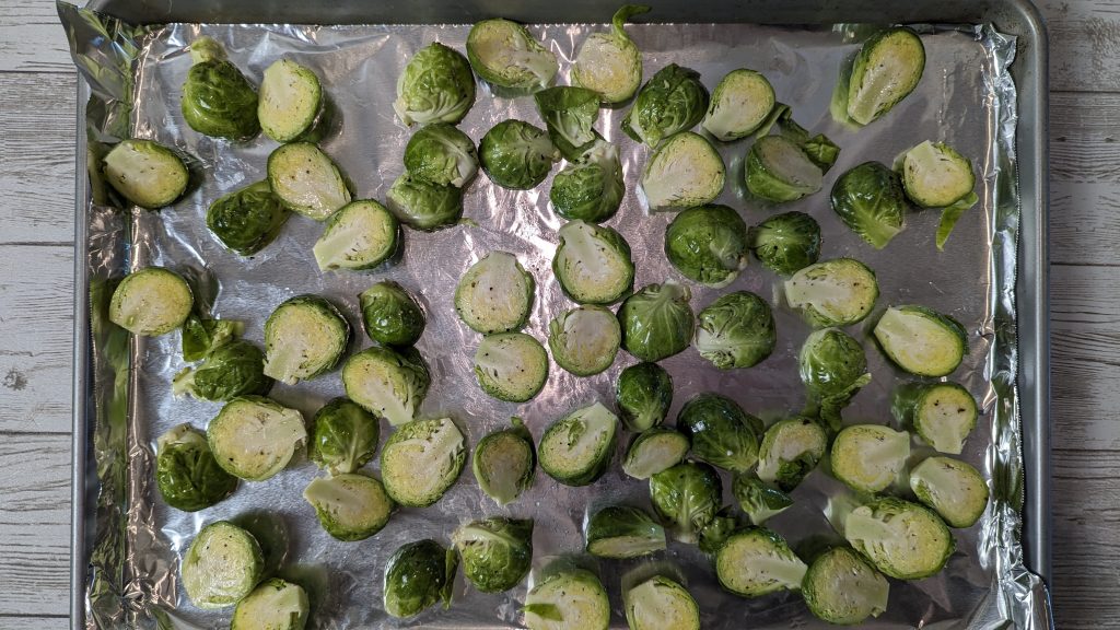 Spread coated brussels sprouts on a foil-lined baking sheet. Place in oven at 450 for 10 minutes.
